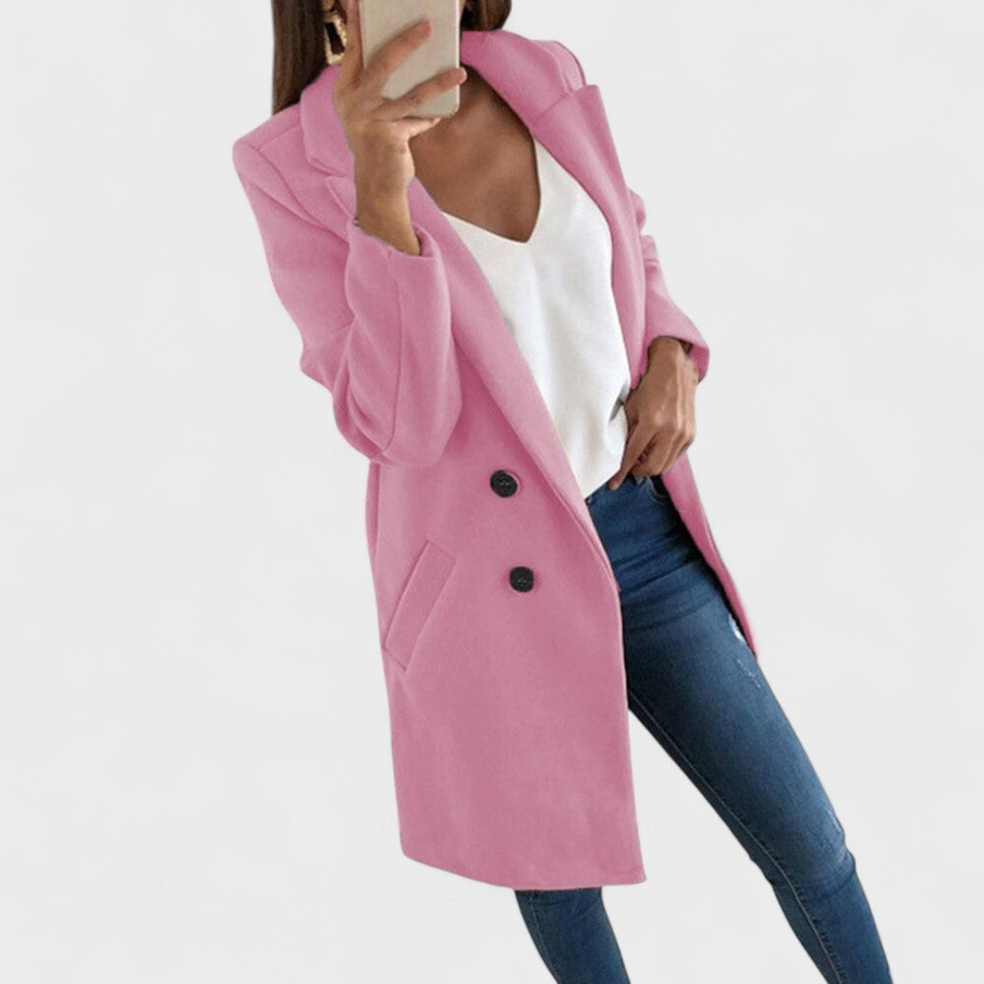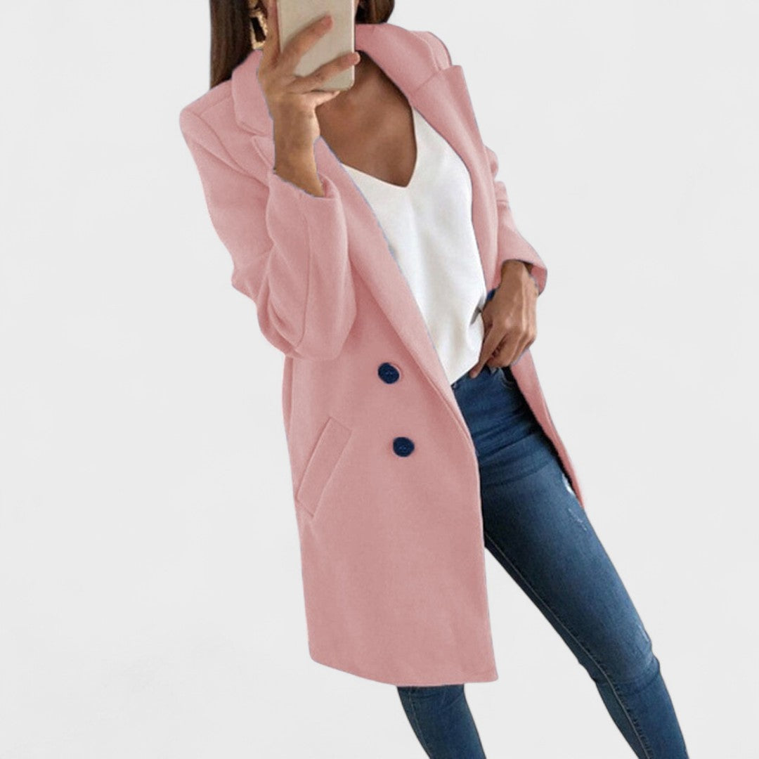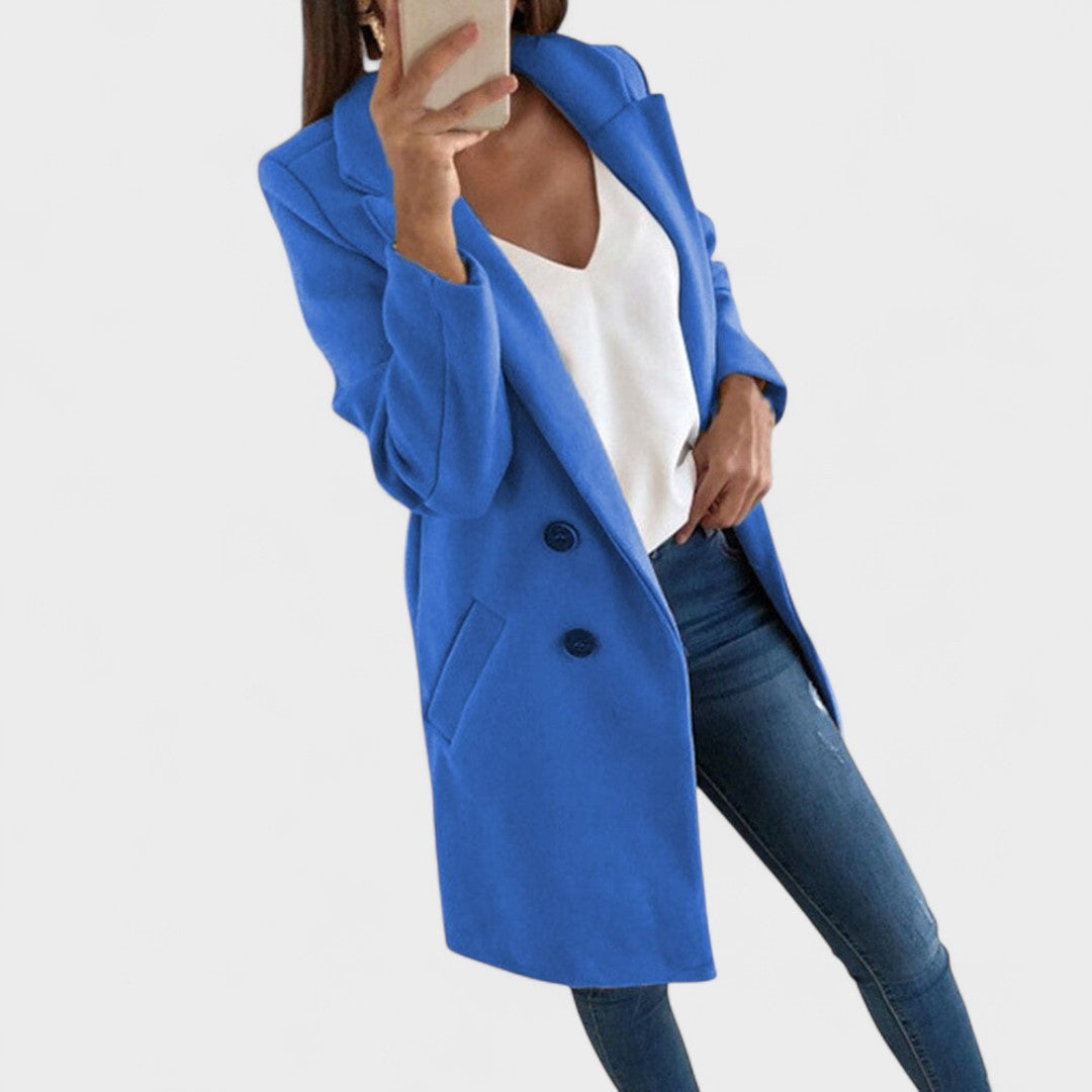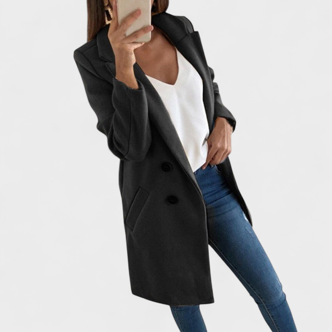 Laskav kroj – čiste linije, reveri i dužina koja vizualno izdužuje figuru.